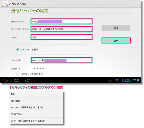 ≪補足≫似たサーバー名が自動読み込みされる場合があるのでご注意くださいセキュリティーの種類: SSL設定選択では『SSL(証明書を全て承認)』を選択。単なる『SSL』選択では設定失敗可能性あり ※通常は「設定しない」