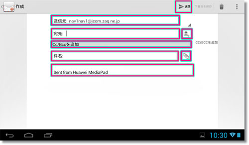★ 送信前に作成保留する場合、「送信」右側の「下書き保存」タップ し、メールを「下書き」フォルダへ移動画面上部「送信」タップすると、ネットワーク接続中ならば、メールが「送信済み」フォルダへ移動