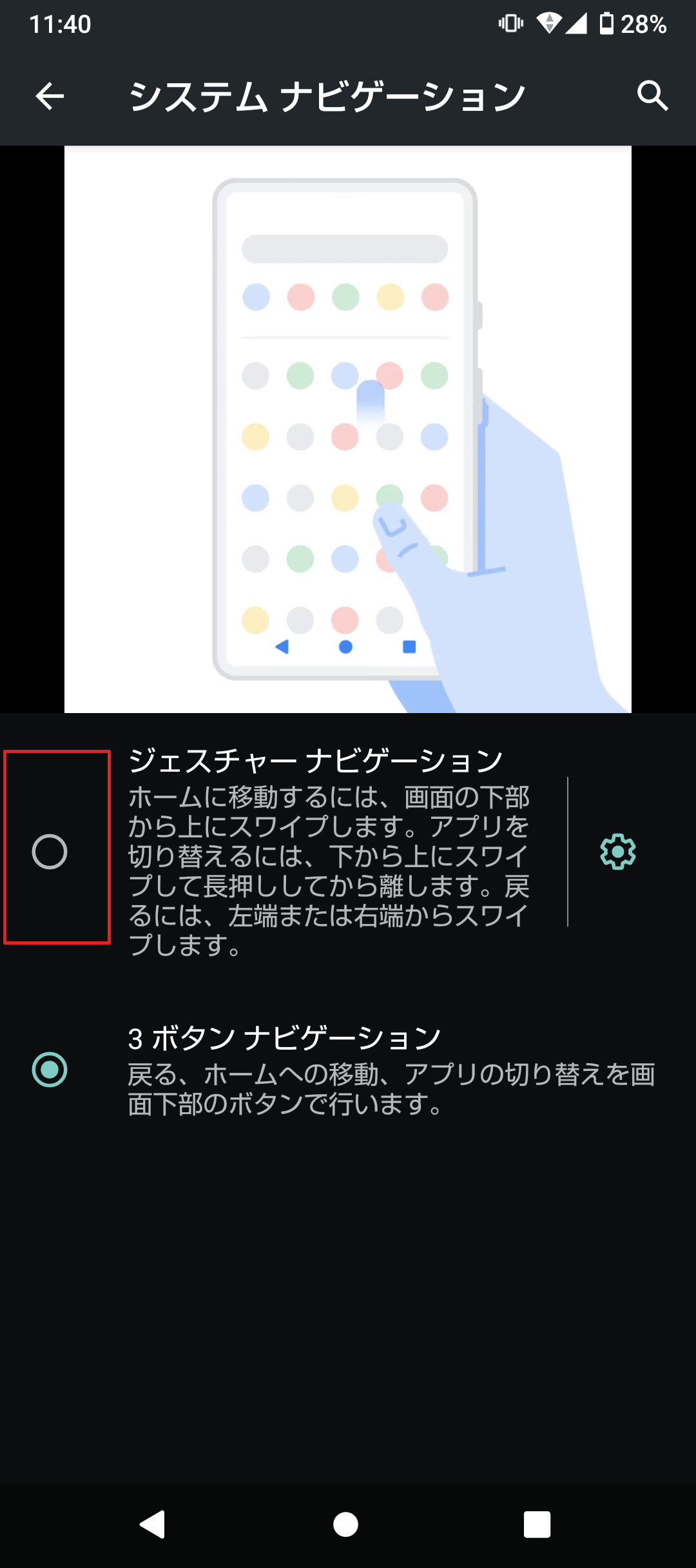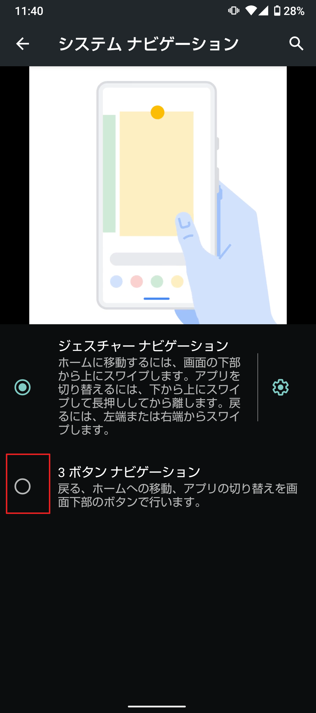 3ボタンナビゲーションからジェスチャーナビゲーションに変更します。